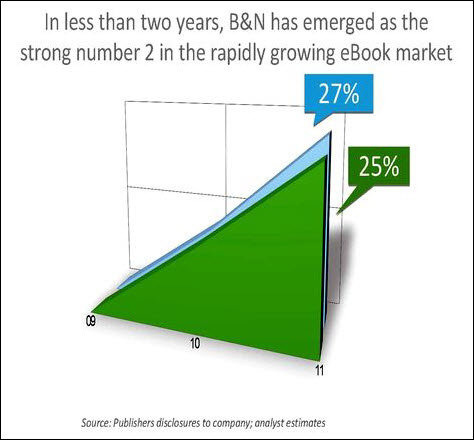 The next correlate to bring into the equation is Barnes & Noble’s ostensible ebook market share relative to Amazon. The going guesstimate for Barnes & Noble is a 27% share. Barnes & Noble is the source for that number: CEO William Lynch used it last year in an investor presentation.