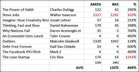 I was surprised. I’ve been plotting these percentages informally for the past six months and Barnes & Noble’s review totals never approached Amazon’s. Amazon is renowned for its well-evolved book review ecosystem – it’s even the subject of academic study. Amazon turns the mere act of reviewing into an ego boost and a potentially prestigious career move. Reviewers actually compete on Amazon. Authors have been apprehended gaming the system and entering grudge matches. When you review a book across the digital road at Barnes & Noble all you get is an auto-generated “thanks”.