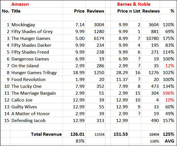 The main weakness in my 15 current bestsellers comparison is accommodating “The Hunger Games Factor”. Barnes & Noble launched a promotion to coincide with the release of the film last month, betting it would be a winner. Barnes & Noble won its bet: the film has already grossed over $300 million while scoring 85% on Rotten Tomatoes. But Amazon has been fighting back in its typically subtle manner, cutting prices by as much as 44% (and free to borrow for Prime Members). Despite the counter-attack, Barnes & Noble is acing the review count.