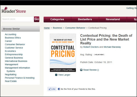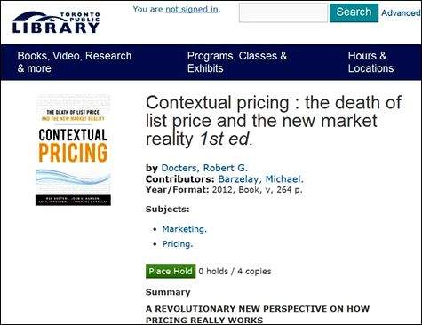 June 12: I should have been more explicit regarding the example of Contextual Pricing, above. The impact of dropping the names of the two other contributors, as expected, is that a search for either “John G. Hanson” or “Cecilia Nguyen” on either the Sony Reader Store or the Toronto Public Library web site produces zero results, as this book is the only volume to which either author has a published contribution. As far as those two sites are concerned, neither author exists. Missing metadata made them disappear.