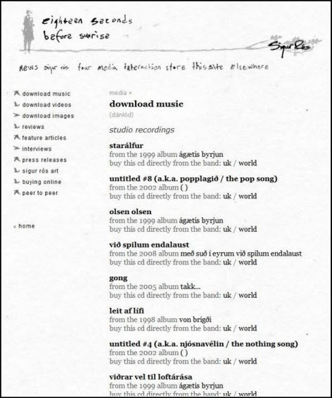 Sigur Rós’s website receives a credit in the “Comments” field. That rang a bell: I’d recently downloaded several free songs from the Sigur Rós site. That must have been one of them. I returned to the site and found lots of sample songs for free download. I listened to them one by one. They were all much larger files than my beautiful short piece and none of them resembled it nor had the same name.