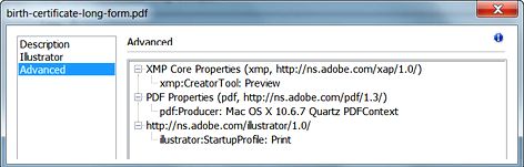 President Obama’s birth certificate can also be downloaded (as a PDF file) from the Whitehouse web site. A quick glance at the metadata in the file shows there’s not much there, just an indication that the file was created on a Macintosh computer directly from the operating system, without additional software.