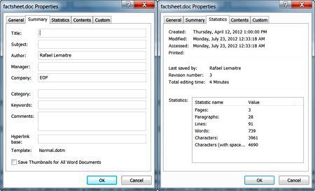 Metadata for one-page documents is far more common and far less complex the metadata for books. Anyone who uses software like Microsoft Word and Adobe Acrobat (or other PDF creation tools) creates metadata every time they save a document. Most people don’t even know they author metadata. But it’s there. Let’s look at some.