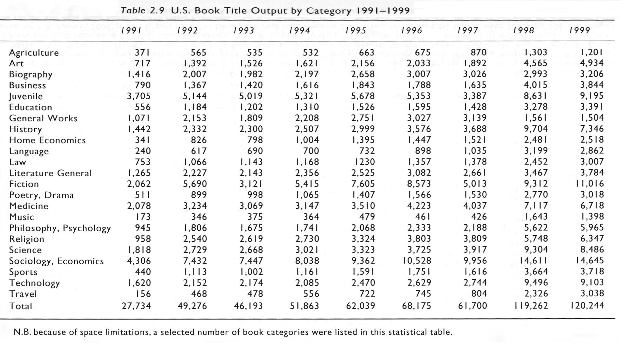 Now to bring book publishing industry stats into focus against the two large industries above, I’ve got two charts from The Book Publishing Industry, 3rd edition (by Albert Greco et al.). The first covers title output from 1940 to 1990; the second from 1991 to 1999 (they’re large, but clickable).